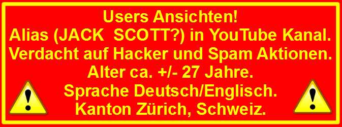 Users Ansichten mit erhebliche Verdacht auf kriminelle Cyber Aktivitäten. In YouTube als Fake Alias (Jack Scott?) Alter ca. +/- 28-Jahre. Sprache Deutsch/Englisch. Kanton Zürich, Schweiz. Seine Fake Alias Tarnung in YouTube ist von Users aufgedeckt. Kriminelles Fake Cyber User Gesindel sind nur Sozialversager mit Lügen, Betrug, Diebstahl mit Unterschlagung sie suchen nur ihren Vorteil mit Schmutzige krimineller Handlungen! Anonyme User meldet. Die Fakten bestätigen seine kriminellen Tätigkeiten.
